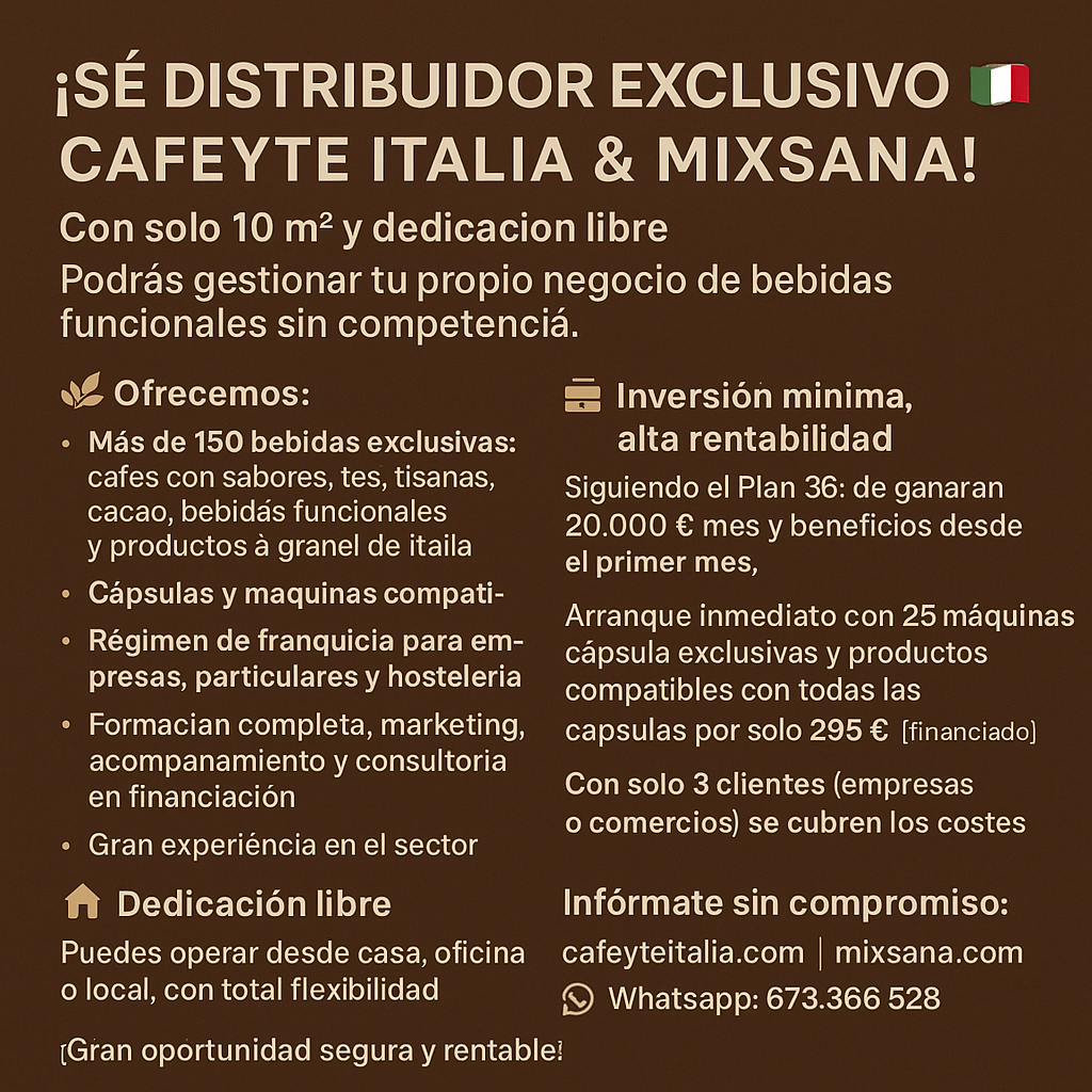 Expande tu negocio ofreciendo 150 variedades exclusivas de cápsulas compatibles. Ideal para comercios y empresas de menos de 10 empleados. ¡Conviértete en distribuidor y destaca en el mercado del café y las infusiones con Mixsana.com!